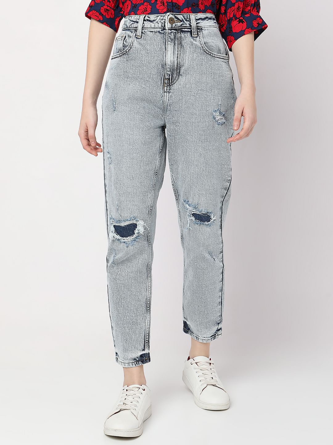 Blue High Rise Distressed Mom Fit Jeans